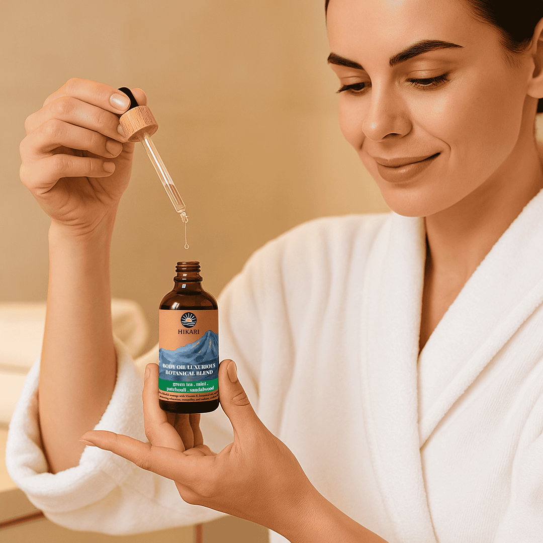 Indulge your skin with HIKARI Luxurious Botanical Body Oil, a premium blend of Green Tea, Mint, Patchouli, and Sandalwood in a nourishing base of natural plant oils. Designed to deeply hydrate, relax the senses, and enhance skin radiance, this lightweight oil is perfect for both massage and daily body care rituals.